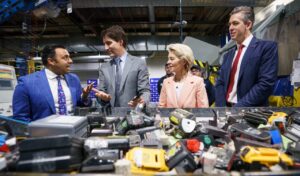 Prime Minister Justin Trudeau and European Commission President Ursula von der Leyen with Li-Cycle CEO Ajay Kochhar (left) and executive chairman Tim Johnston (right) at Li-Cycle’s Spoke facility in Kingston, Ont. Photo: Adam Scotti via Li-Cycle.